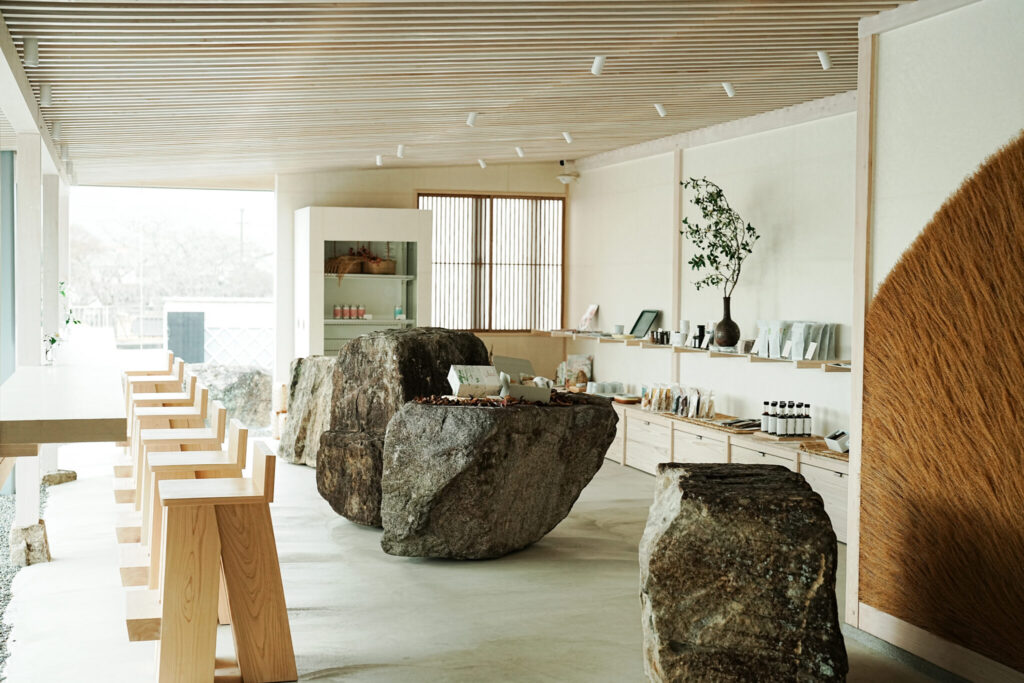〈大西さん〉はじめはブランドのネーミングの提案でしたね。「霧の朝」という名前はこのあたりの風土や環境を捉えていて気に入りました。ロゴやパッケージデザインについては「正直わからない」が先行していたし、小菅さんの感覚や判断に頼る部分は大きかったです。特に2025年にオープンした店舗については、当初カフェなどをやる予定はなくて「スモールスタートでいい」と思っていたんですが、「はじめに大きく振ったほうがいい」と提案されたんです。クリエイターの感覚にどこまで委ねるべきかも迷いました。でも結局は「自分の想像を超える経験」をしていて、同じ時間を共にしてきた仲間たちが提案するなら「それがよい」と判断していきました。おどおどとプレッシャーを感じながらも、それを「信じてみよう」と決めたんです。感覚的な部分もあるし、特に社内や身内に対しては判断の説明も難しさがあり、正直、不安に思われていたとも思います。